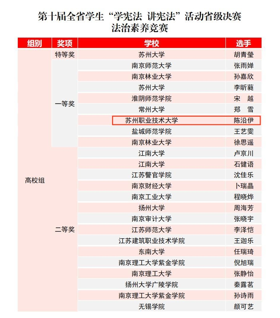 近日,由江苏省教育厅主办的第十届全省学生“学宪法 讲宪法”法治竞赛落下帷幕。我校商学院2023级法律事务专业陈沿伊同学凭借出色表现,荣获省级决赛法治素养竞赛一等奖,不仅为学校实现了该项赛事一等奖“零的突破” ,更使我校成为本届赛事中唯一获此殊荣的职业院校。其指导教师黄耀博士荣获“优秀指导教师”称号。