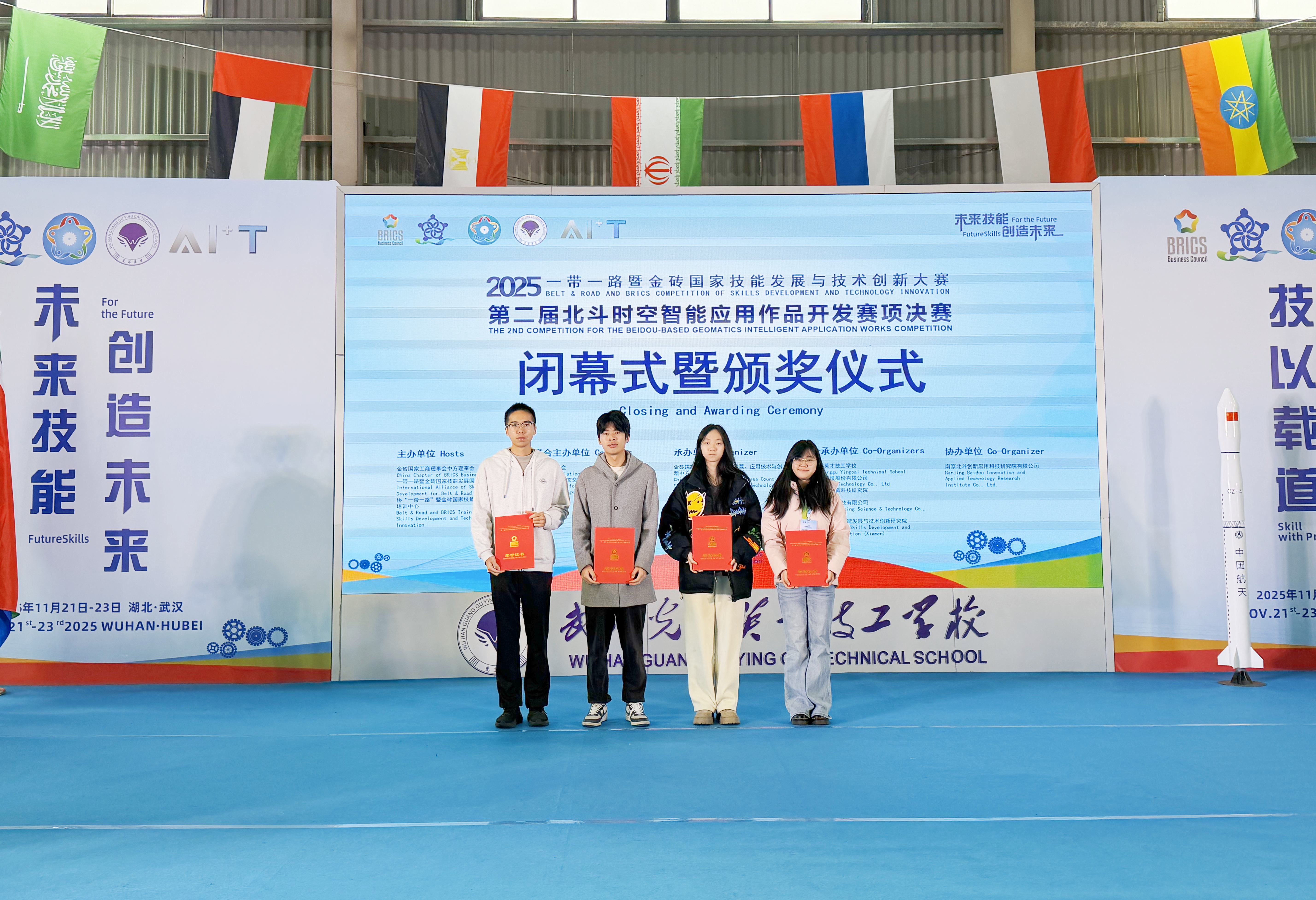 近日,2025“一带一路”暨金砖国家技能发展与技术创新大赛之第二届北斗时空智能应用作品开发赛项决赛在湖北武汉圆满落幕。本次大赛汇聚全国70余支精英队伍同台竞技,我校刘冰新、吴楠楠同学凭借扎实的专业功底、创新的实践能力脱颖而出,荣获国赛高职组一等奖,吴子月、杨本冠同学获三等奖,栗苑、朱晖两位教师获评“优秀指导教师”称号,学校被授予“最佳组织奖”。