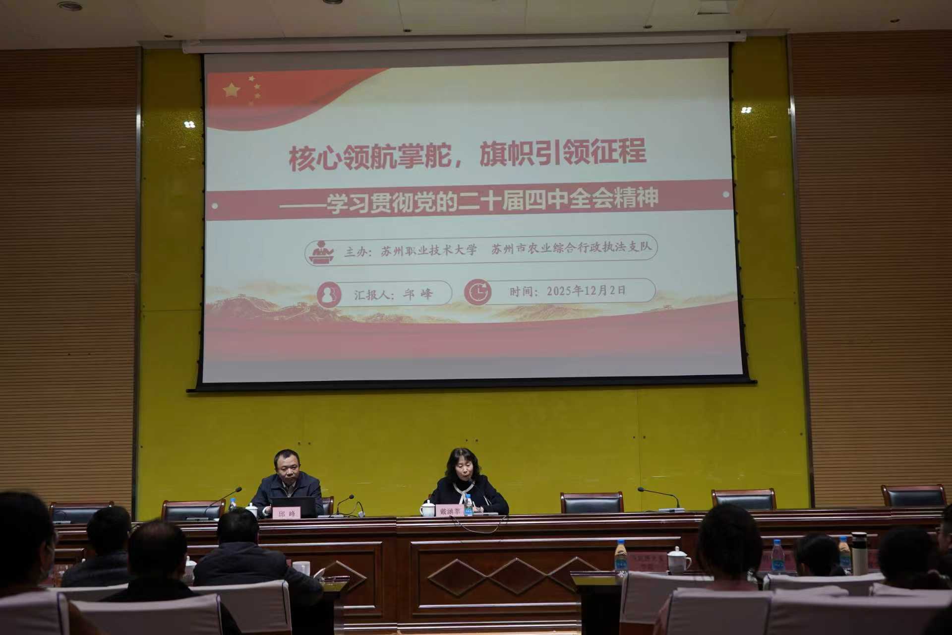 12月2日下午,由苏州职业技术大学、苏州市农业综合行政执法支队联合主办的第二十届先锋论坛“学习贯彻落实党的二十届四中全会精神”主题宣讲暨“石湖思政大讲堂”在我校图书馆报告厅举行。本次活动由校党委组织部、党委宣传部、商学院党总支、计算机工程学院党总支等部门共同组织。中共二十大代表、江苏省政协委员、苏州市农业综合行政执法支队支队长、党委书记邱峰同志应邀作主题宣讲。各学院党总支书记、副书记,校民主党派、无党派人士代表,马克思主义学院教师代表、学生入党积极分子、团学干部代表,以及苏州市农业综合行政执法支队一线执法人员等共计200余人参加活动。