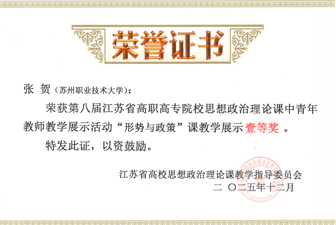 12月13日,由江苏省高校思想政治理论课教学指导委员会主办的第八届江苏省高职高专院校思想政治理论课中青年教师教学展示活动在无锡科技学院圆满落幕。我校马克思主义学院教师张贺在激烈竞争中脱颖而出,荣获“形势与政策”课教学展示一等奖,展现了学校思政课教学改革和师资队伍建设的最新成果。
