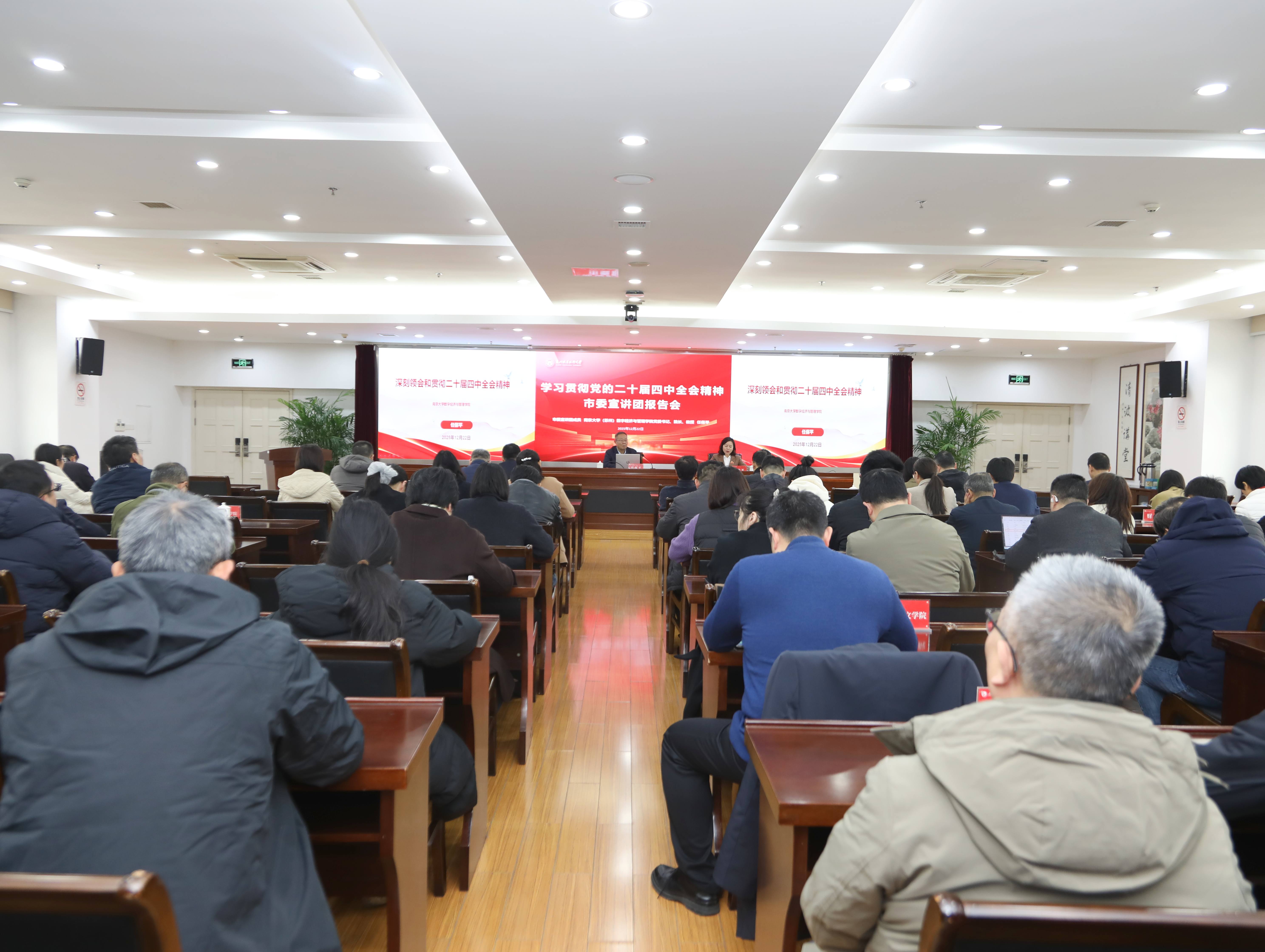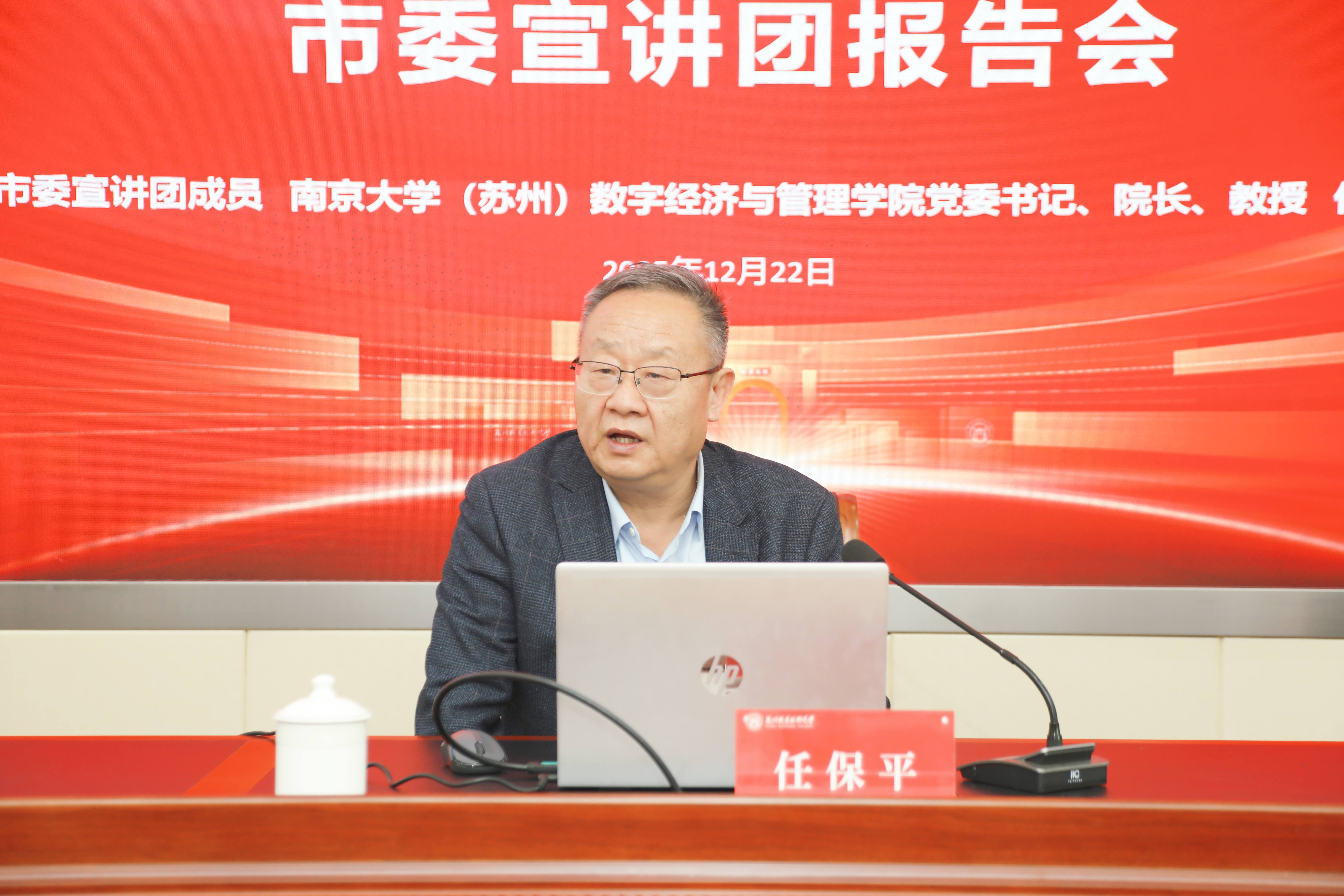 12月22日,我校在惠和楼317会议室举行学习贯彻党的二十届四中全会精神市委宣讲团报告会。市委宣讲团成员、南京大学(苏州)数字经济与管理学院党委书记、院长、教授任保平来校作宣讲报告。校领导、全体中层干部参加报告会。报告会由校党委书记温贻芳主持。