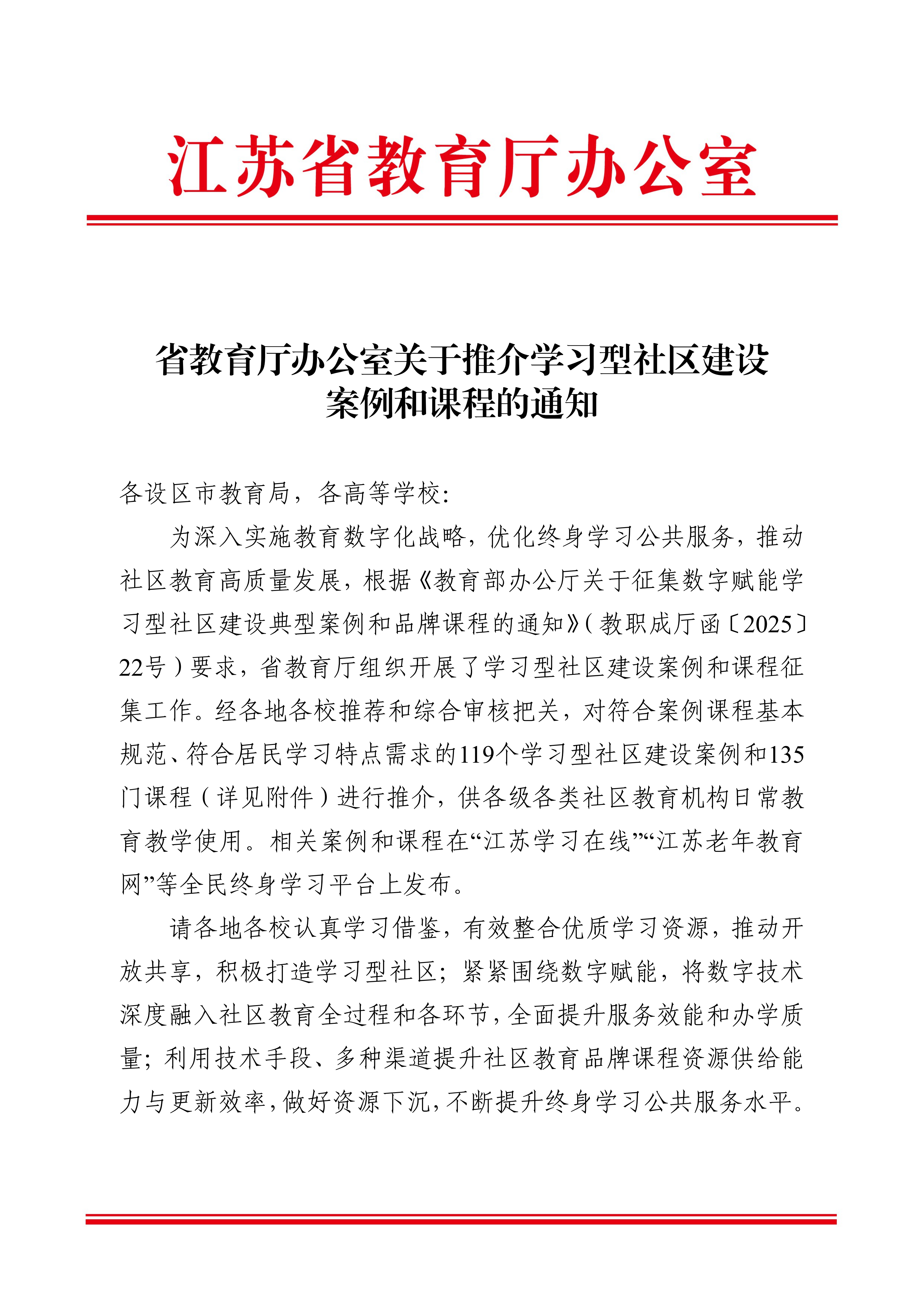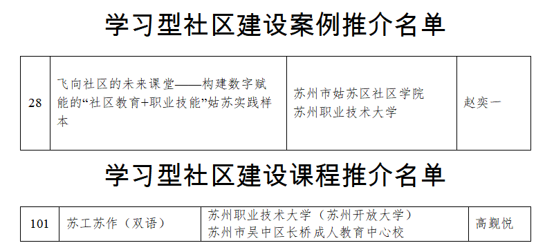 12月30日,江苏省教育厅办公室发布《关于推介学习型社区建设案例和课程的通知》,正式公布全省119个学习型社区建设优秀案例和135门优质推介课程。我校联合姑苏区社区学院打造的《飞向社区的未来课堂——构建数字赋能的“社区教育+职业技能”姑苏实践样本》成功入选优秀案例;与吴中区长桥成人教育中心校合作开发的《苏工苏作(双语)》课程跻身优质推介课程名单。两项成果同时获省级认可,彰显了学校在服务终身学习体系建设、推动社区教育高质量发展中的实践成效与示范价值。