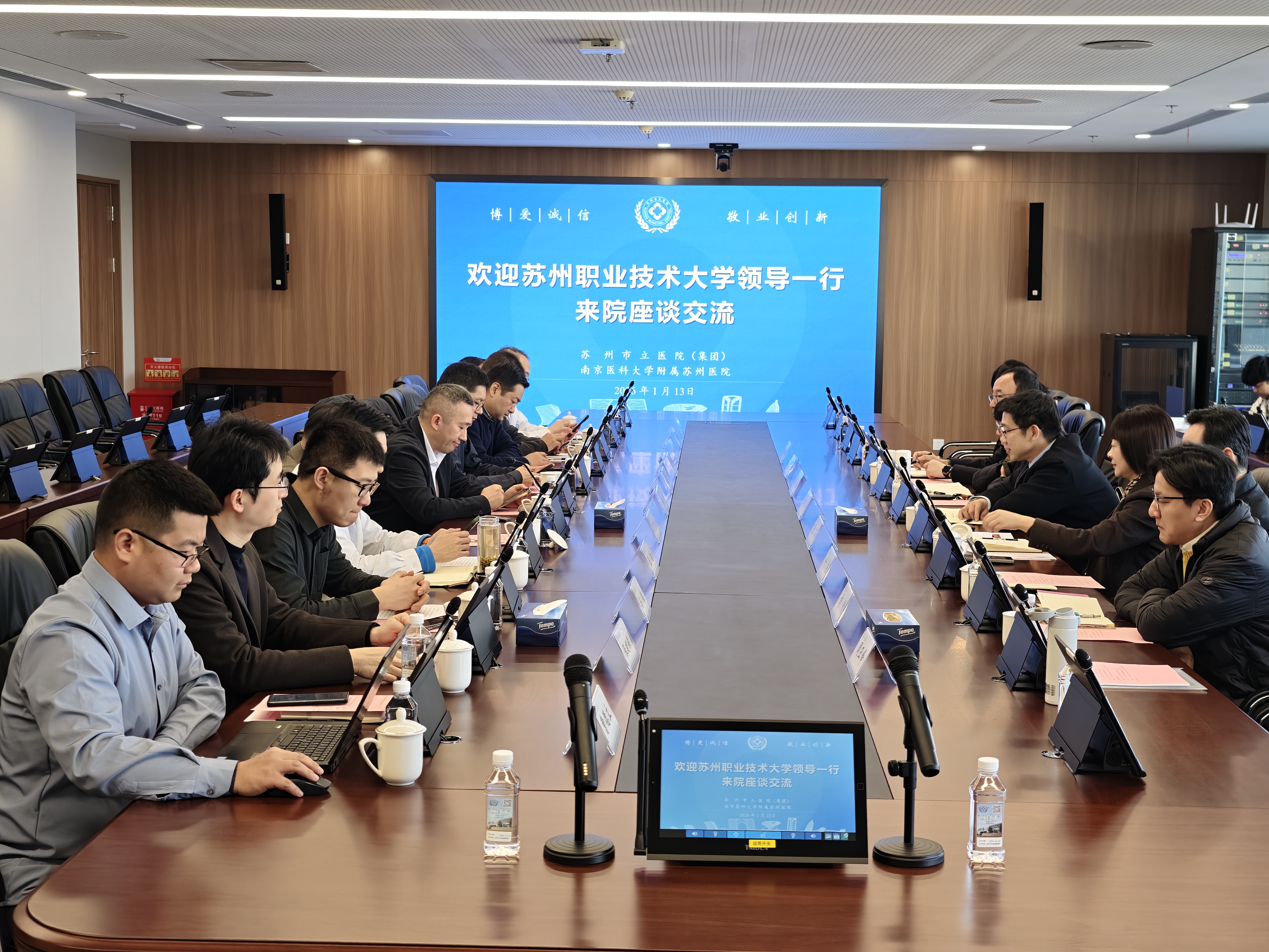 1月13日,校长陈峻一行赴苏州市立医院太湖总院,就深化校院合作、共同推动智慧康养与医养结合工作进行专题交流。校科技处、计算机工程学院、教育与人文学院,苏州市立医院党委副书记、院长陈彦及相关职能部门负责人参加座谈。