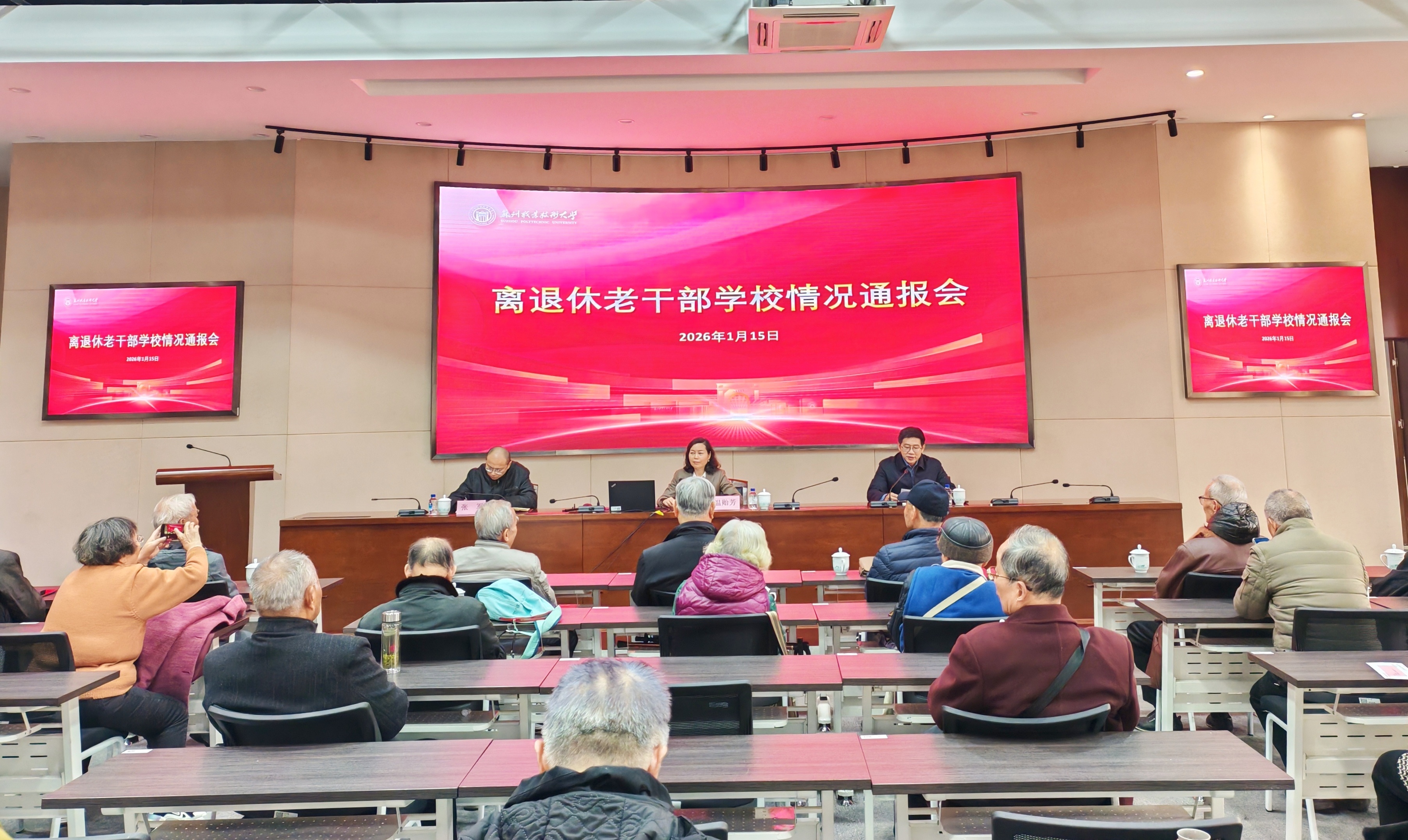 1月15日上午,2025年下半年离退休老干部学校情况通报会在干将路校区通和楼会议室举行。校党委书记温贻芳、校长陈峻、副校长张军出席通报会,学校离退休老领导及省级以上专家劳模、党委办公室、行政办公室、离退休干部处主要负责人参加会议。会议由陈峻主持。