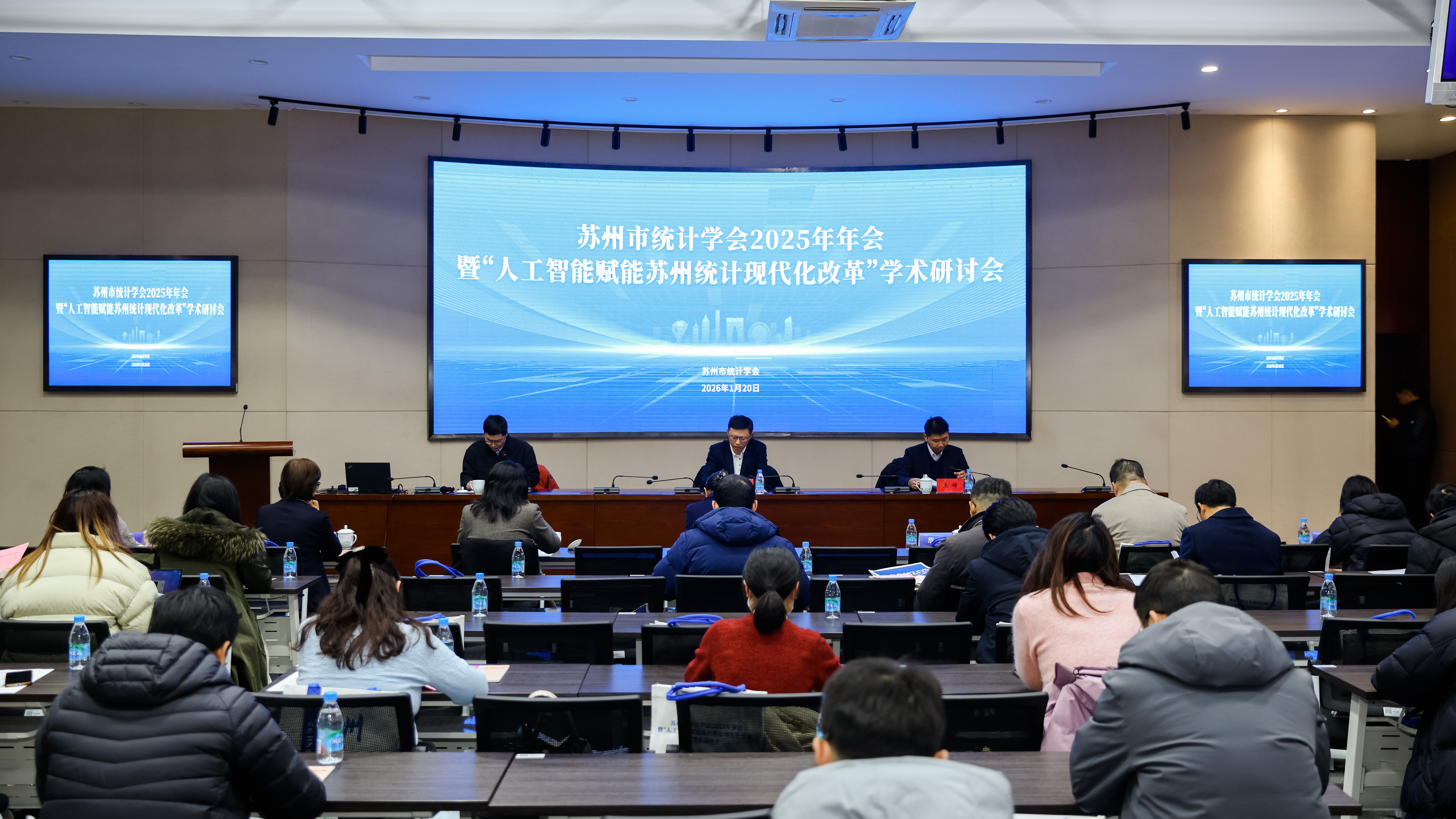 1月20日下午,苏州市统计学会2025年年会暨“人工智能赋能苏州统计现代化改革”学术研讨会在干将路校区成功举办。苏州市统计局党组书记、局长钱宇,我校副校长王峰出席会议并致辞。来自苏州市统计局、国家统计局苏州调查队、学会理事代表及获奖论文作者代表等约60人齐聚一堂,共话统计创新发展。