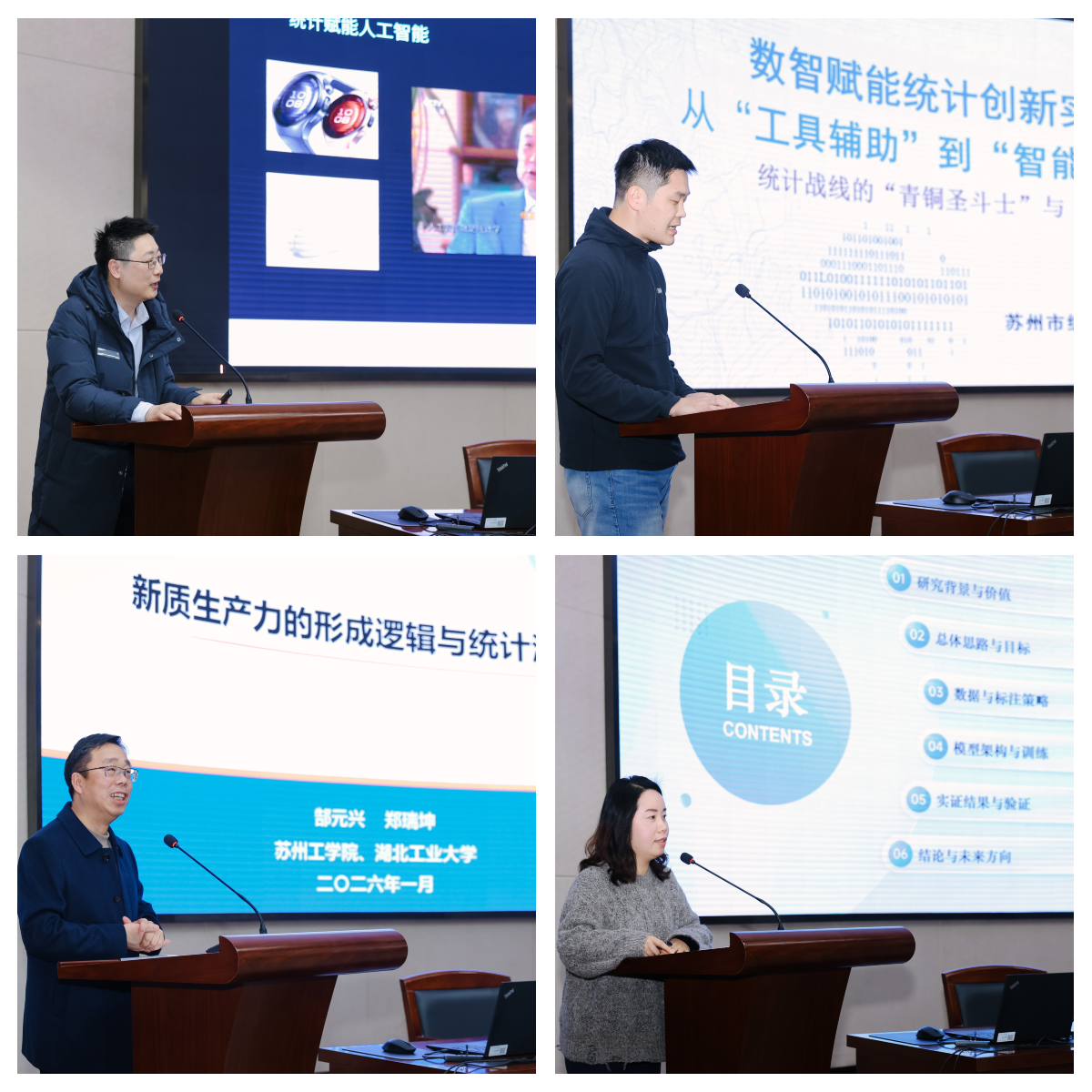 会议的第二阶段由学会副会长严继高主持。在专家主旨报告环节,苏州大学未来科学与工程学院唐煜教授和苏州市统计局副处长吴政分别围绕“人工智能时代下统计的挑战和机遇”“数智赋能统计创新实践”等议题作了精彩报告,引发与会学者的热烈反响。优秀论文交流环节,苏州工学院数学与统计学院副院长郜元兴和国家统计局苏州调查队处长陆婷分别就“新质生产力的形成逻辑与水平测度”“基于机器学习的政务热线工单情感分析研究”等论文作了精彩分享,现场互动频繁,参会学者就论文中的热点问题、实践应用等展开深入探讨。