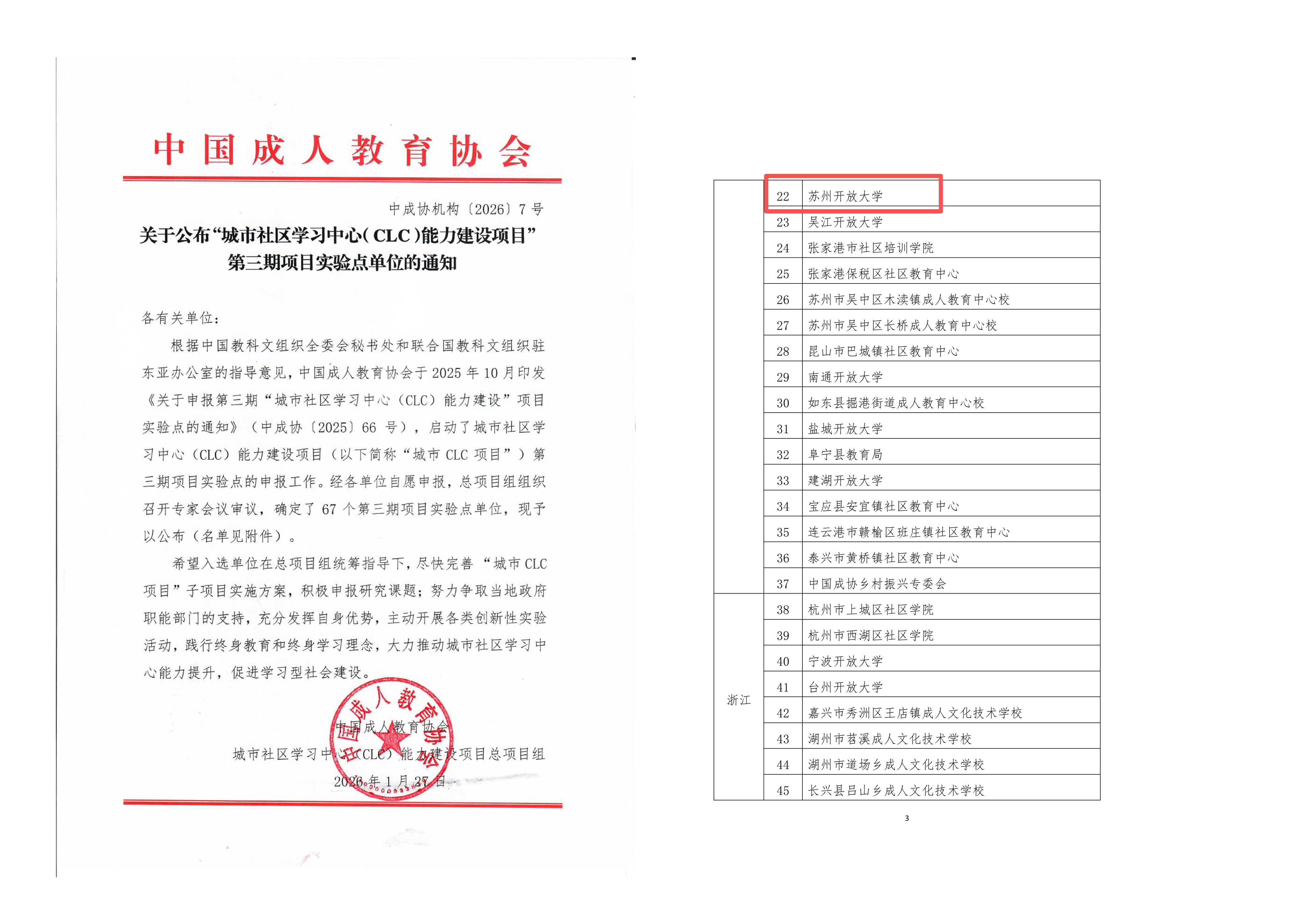 我校长期以来扎根苏州、服务地方,打造了“智学苏州”智慧教育平台、市民学习地图等品牌项目,社区教育服务覆盖率达90%以上。此次入选CLC实验点,将着重围绕“基于协同理念的县域社区学习中心建设”开展实践研究,推动资源整合、品牌塑造与数字赋能,进一步强化校地协同、城乡联动,为社区居民提供更优质、更便捷的学习服务,为全国社区学习中心建设贡献智慧与力量,助力学习型社会与学习型城市建设迈向新台阶。