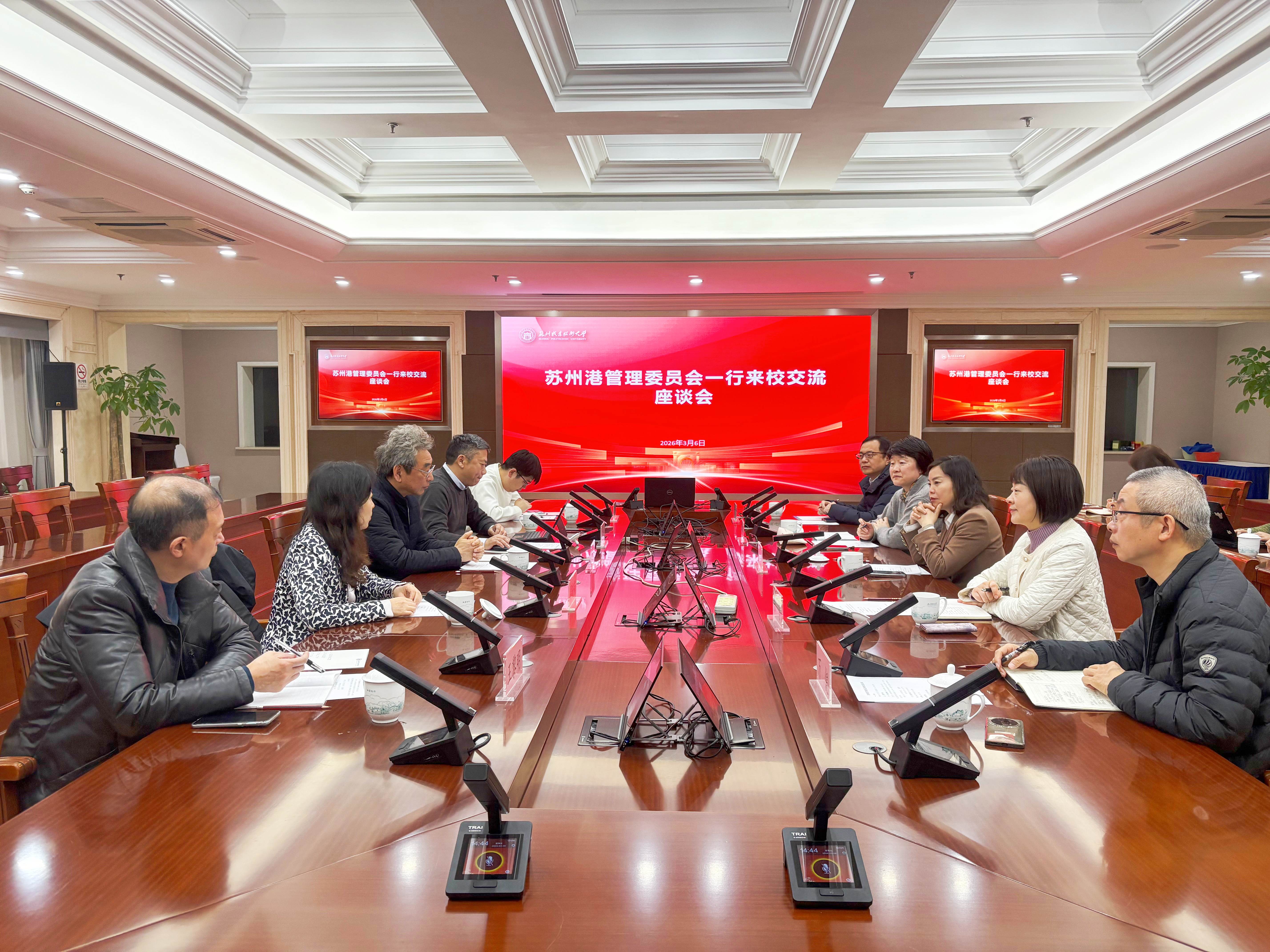 3月6日下午,苏州港管委会办公室副主任周晓荷,苏州港管委会原常务副主任、太仓口岸协会顾问胡鸿,江苏恒隆物流有限公司副总经理卢亚强一行来校考察交流、洽谈合作。校党委书记温贻芳接待了来访嘉宾,相关职能部门和学院负责人陪同交流。
