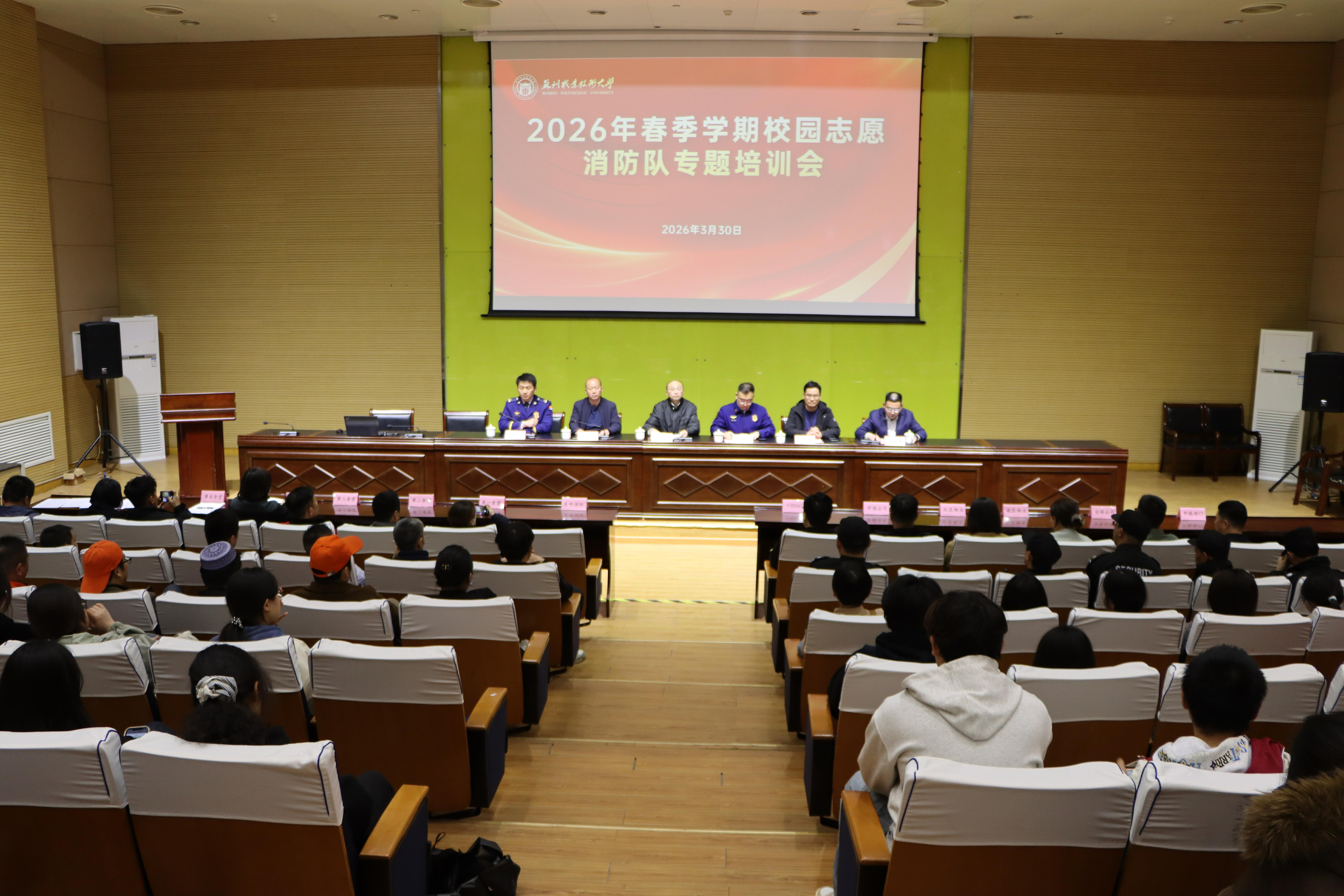 为强化校园消防安全管理,夯实志愿消防队履职能力,3月30日下午,我校在图书馆报告厅举办志愿消防队消防安全专题培训会。校党委委员、副校长张军,吴中区消防救援局监督员周庆,龙翔路消防救援站副站长周越峰,总务处、保卫处、学园公司等相关部门负责人出席,各志愿消防分队、安全宣传志愿者及各学院学生共约200人参加培训。培训会由保卫处处长周传勇主持。
