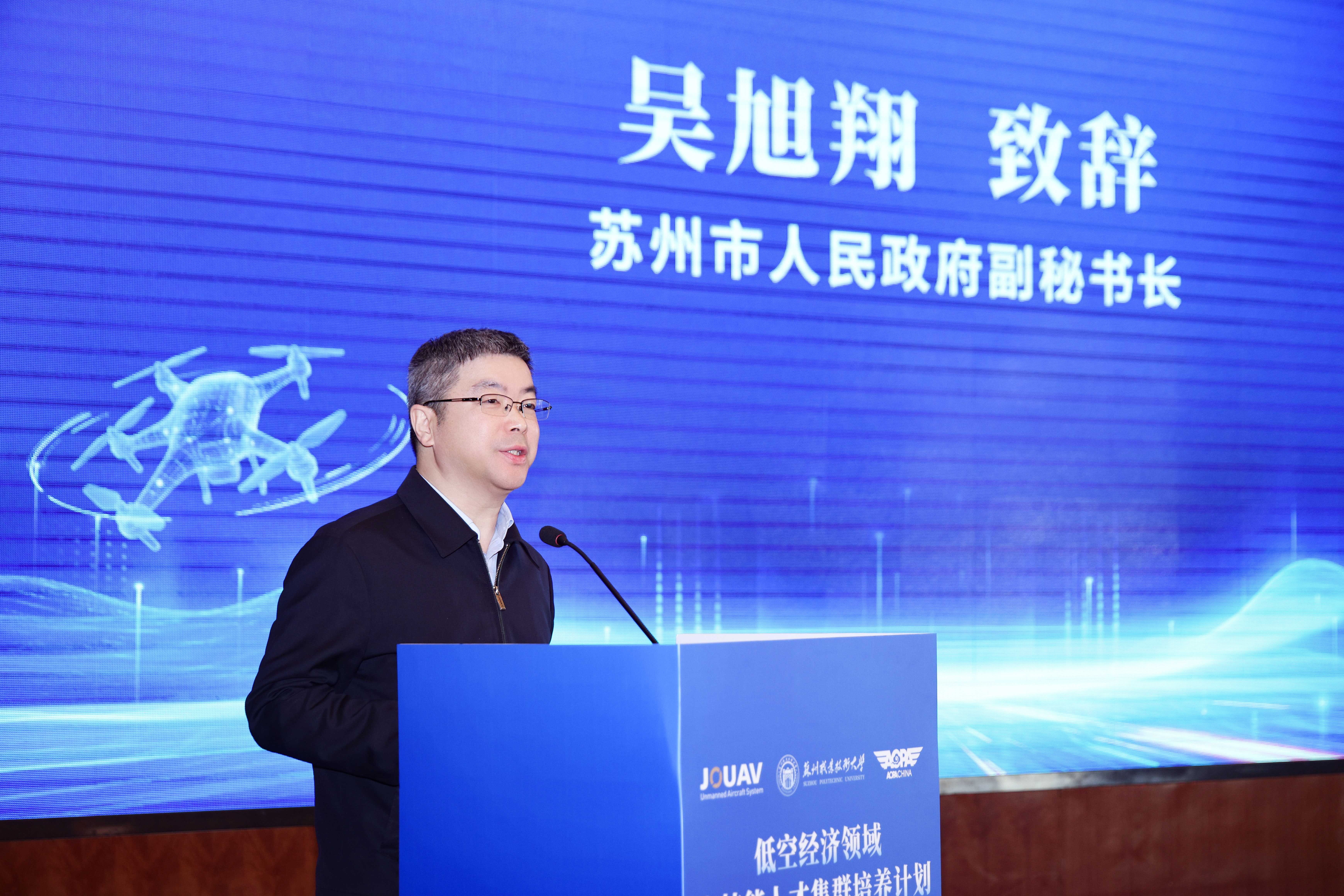 吴旭翔在讲话中强调,低空经济是苏州重点布局的战略性新兴产业,是培育新质生产力的重要突破口,苏州职业技术大学要加快探索高技能人才供给的成熟路径,构建产教融合的“创新生态”;苏州市将持续优化政策保障,构建政行企校协同的“服务体系”,打造低空经济人才精准供给的“苏州样板”。